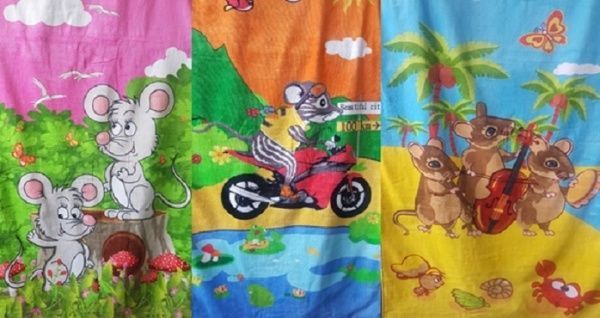 Полотенца с ярким рисунком сделаны их 100% хлопка. Имея небольшую плотность и износостойкость полотенца быстро сохнут и не теряют насыщенность цветов после многочисленных стирок. На стороне велюра нанесен рисунок, другая сторона остается не окрашенной.