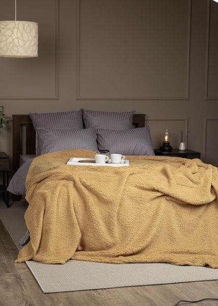 Плед  из искусственного меха, его ворс имитирует мех овчину, имеет мягкую и приятную на ощупь текстуру с достаточно коротким ворсом. Благодаря однотонной расцветке он подойдет к любому интерьеру и будет сочетается с любым постельным бельем. В отличие от изделий из натурального меха, его можно стирать в стиральной машине, а после стирки достаточно хорошо встряхнуть, чтобы вернуть ему первоначальный вид. Рекомендации по уходу: машинная стирка до 40 градусов, не сушить в стиральной машине, нельзя гладить, не отбеливать, не подвергать химической чистке.